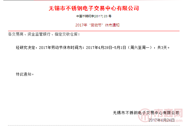 2017年4月24日無錫市不銹鋼電子交易中心官網發布2017年“勞動節”休市通知,4月29日至5月1日共3天休市。